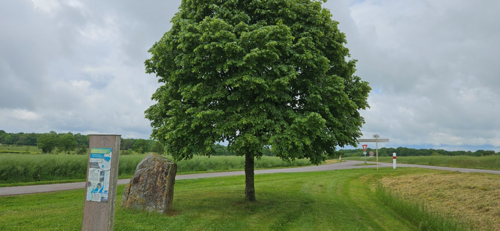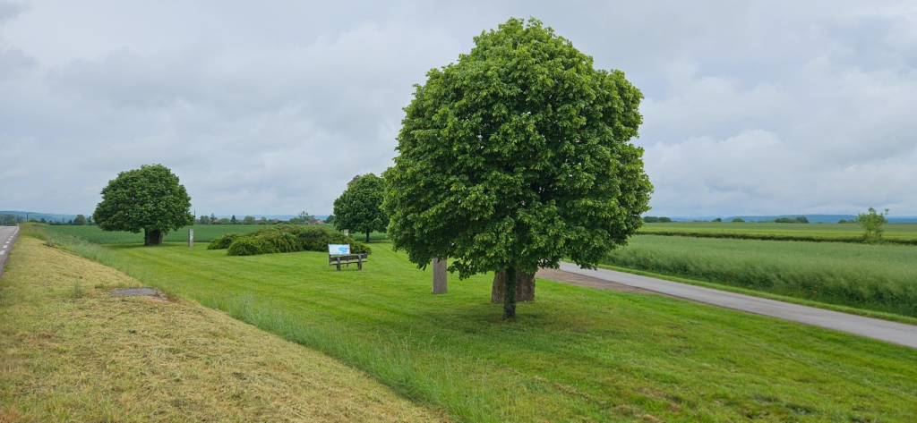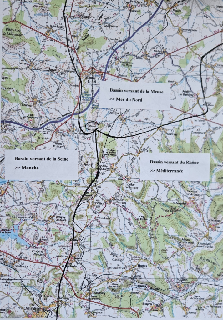 Au village, j’ai discuté avec un habitant sur le pas de sa porte. Je ne voulais surtout pas m’égarer. Ce premier tripoint est en plein champs, au bout d’un chemin rural en cul-de-sac d’environ 3 km. Un aménagement est en cours de conception, mais rien n’est encore en place. Ni une signalisation sur site, ni même une pancarte directionnelle en quittant la petite route départementale. Faudrait revisiter le site dans quelques années. En approchant lentement à pied, on perçoit une légère croupe. De là, les eaux s’écoulent vers la Méditerranée via le Rhône, vers la Mer du Nord via la Meuse, ou vers la Manche via la Seine.