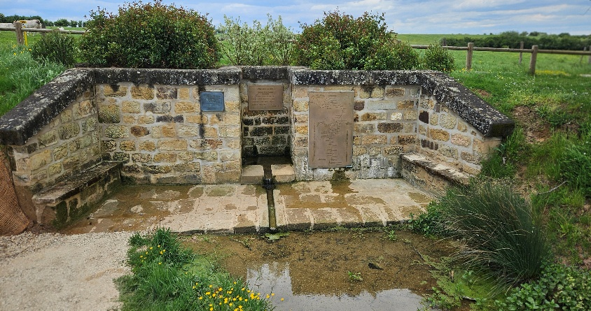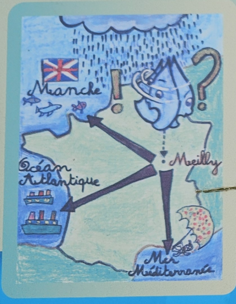 Sur une pelouse triangulaire, le site est mis en valeur en bordure immédiate de la D 981, intersection avec la rue Monchampeau. Je cite le panneau didactique : « Les voyages de trois gouttes de pluie… Ici, cette curiosité géographique est symbolisée par des arbustes au centre en forme de rose des vents pour les quatre points cardinaux, puis par trois arbres plantés chacun auprès d’une pierre pour montrer vers où les eaux s’écoulent : un arbre pour le bassin Seine-Normandie, un autre pour le bassin Loire-Bretagne et le troisième pour le bassin Rhône-Méditerranée ». A côté de chaque arbre, un panneau explique le voyage d’une goutte de pluie vers la Manche, l’Atlantique ou la Méditerranée. Pour exemple, je vous livre ci-après et in extenso le voyage d’une goutte de pluie vers la Manche. Poésie non signée !… Quant au dessin du panneau principal, il est l’œuvre des élèves de Créancey : Grande Section de l’école maternelle, CP et CE1. J’affectionne particulièrement la goutte d’eau de pluie qui ne sait vers où se tourner…
